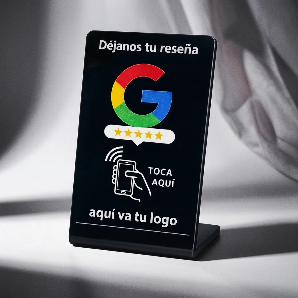 Expositor NFC personalizado con tu logo para conseguir reseñas en Google de forma profesional y automática.